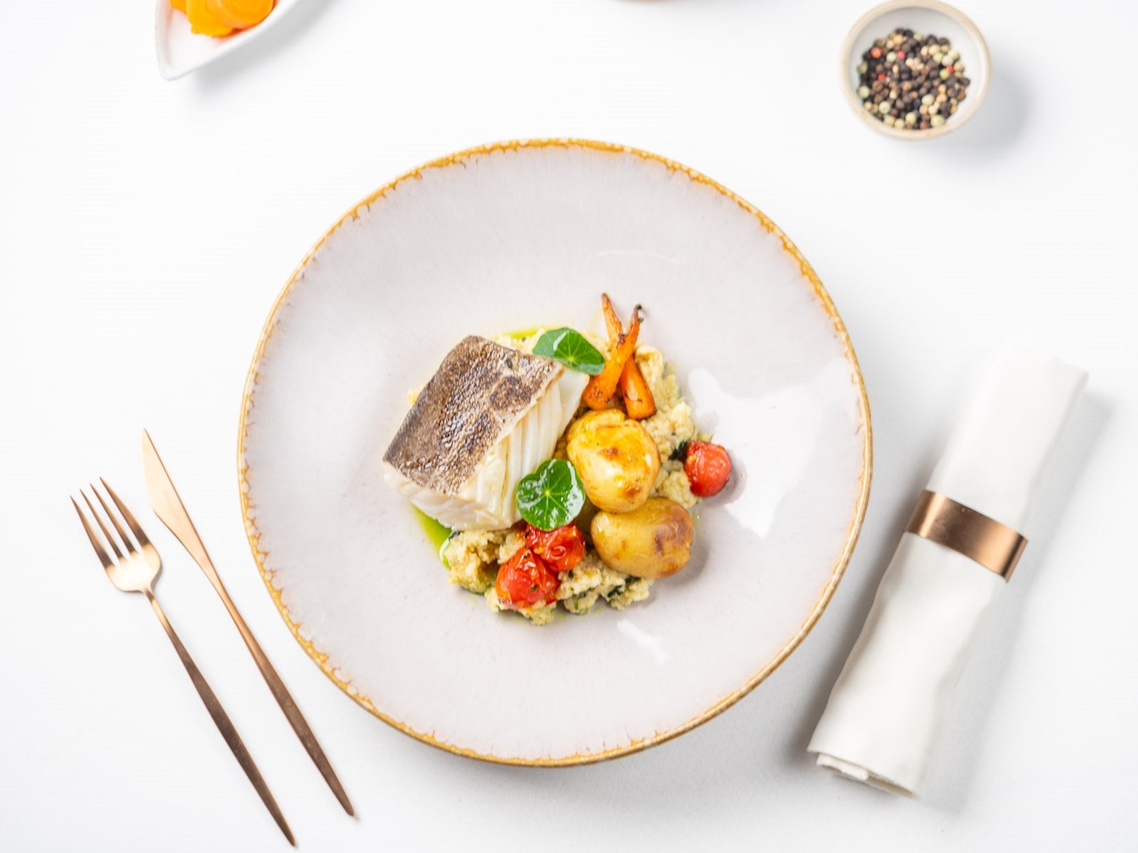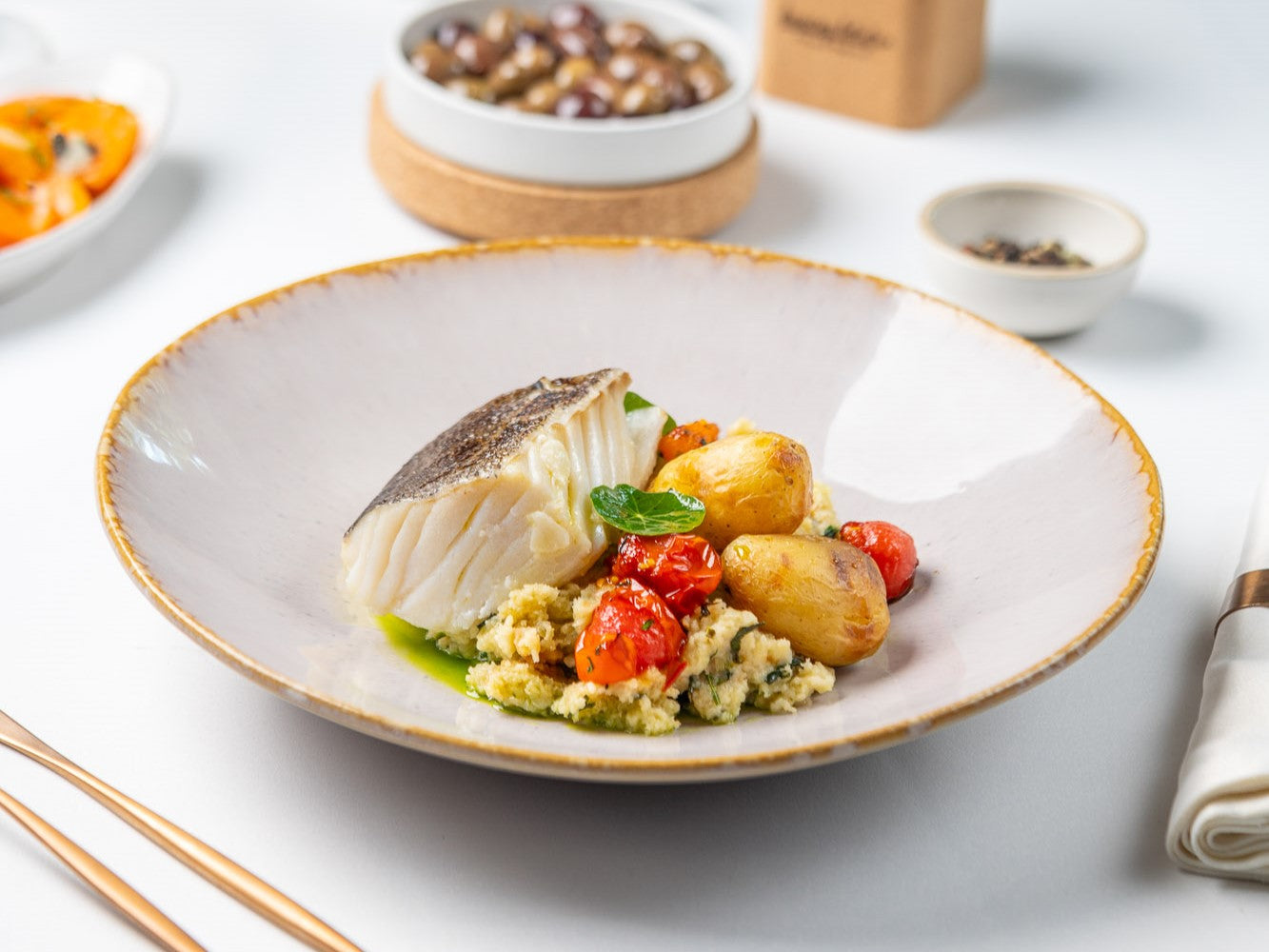 File de cod, maturat prin procesul tradițional portughez de sărare, servit cu açorda de pâine și usturoi, cartofi „à murro” și legume sotate – 320g
